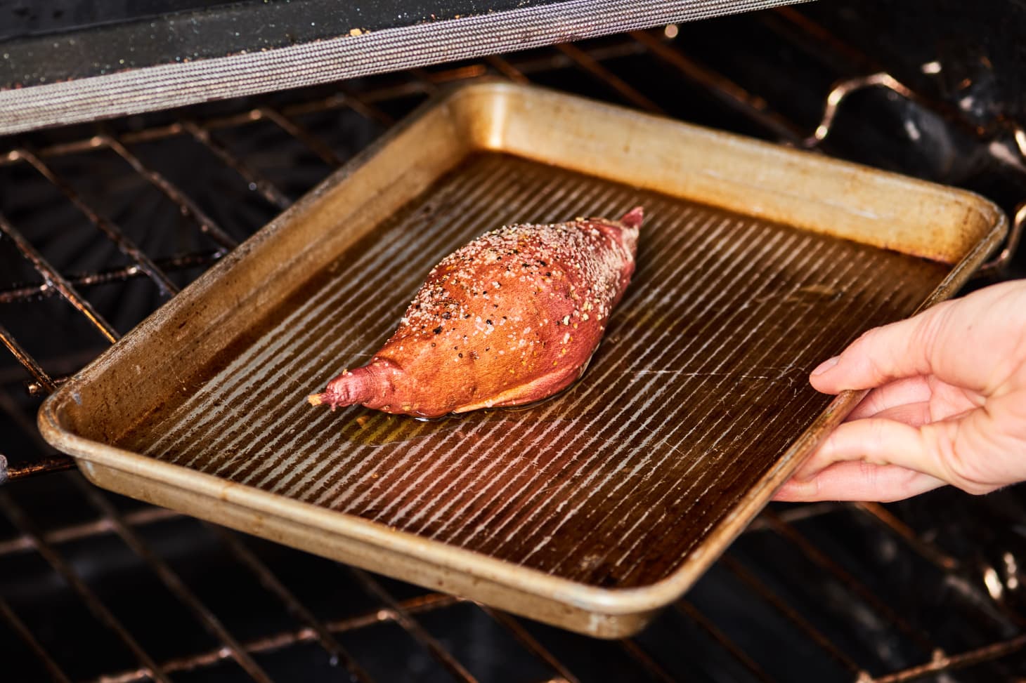 No need to wait an hour for an oven baked sweet potato when you get the same tasty results drizzle the olive oil over the sweet potatoes and season with the sea salt.